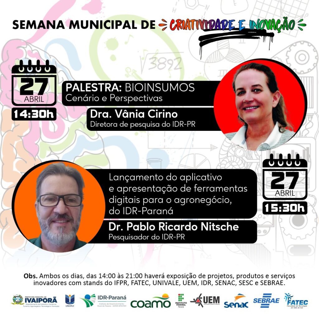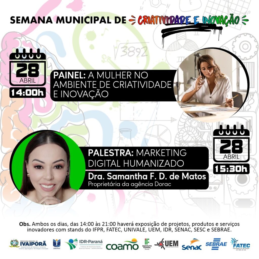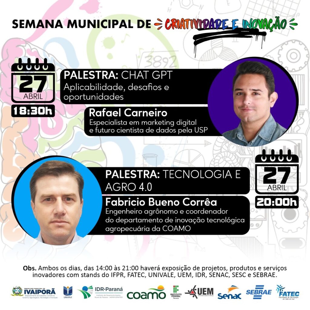 O Departamento de Tecnologia e Inovação da Prefeitura de Ivaiporã realizará a Semana Municipal de Inovação no Centro Cultural Olívia Hauptmann, na quinta e sexta-feira, dias 27 e 28 de abril, entre as 14h00 e 20h00, quando haverá exposição de projetos, produtos e serviços inovadores com stands do IFPR, Fatec, Univale, UEM, IDR, Senac, Sesc e Sebrae.