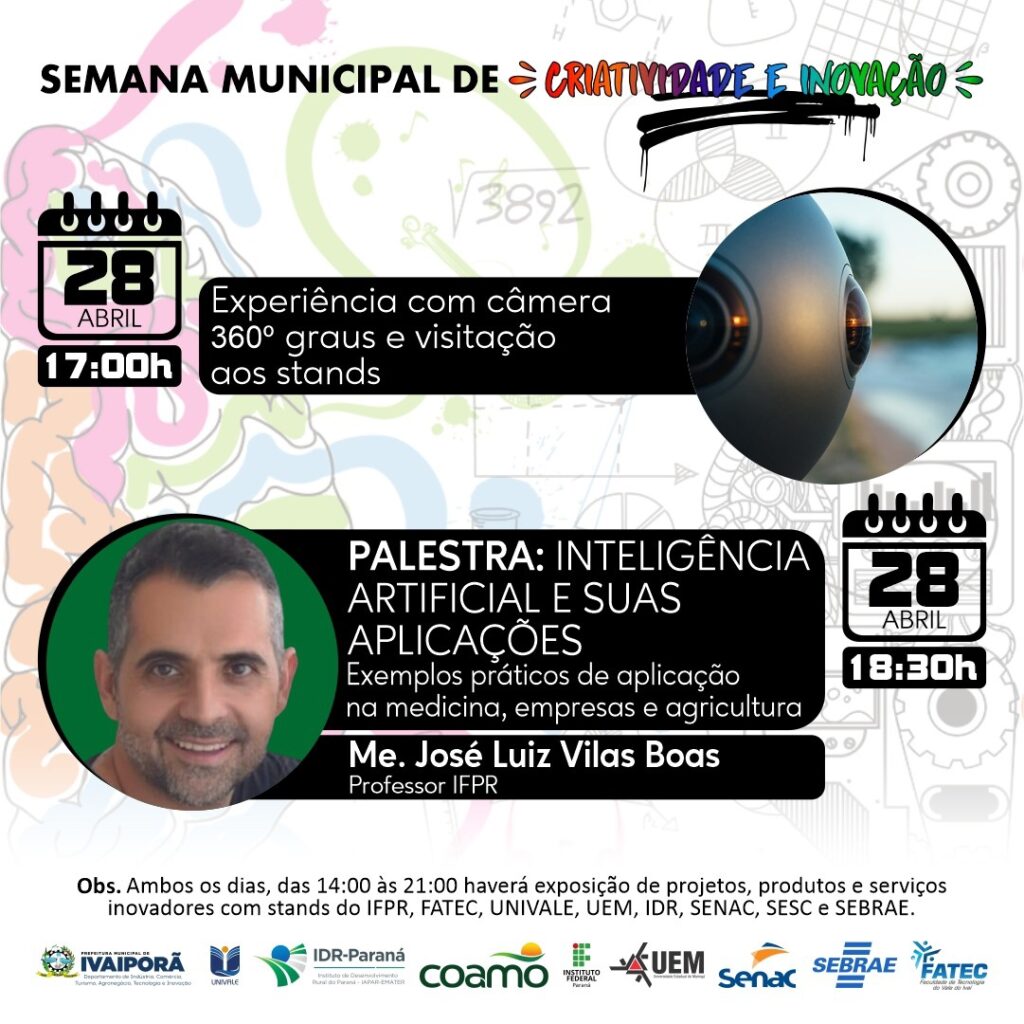 18h30 – Palestra sobre Inteligência Artificial e Aplicações – exemplos práticos na medicina, empresas e agricultura. Com o professor do IFPR, José Luiz ViIas Boas.