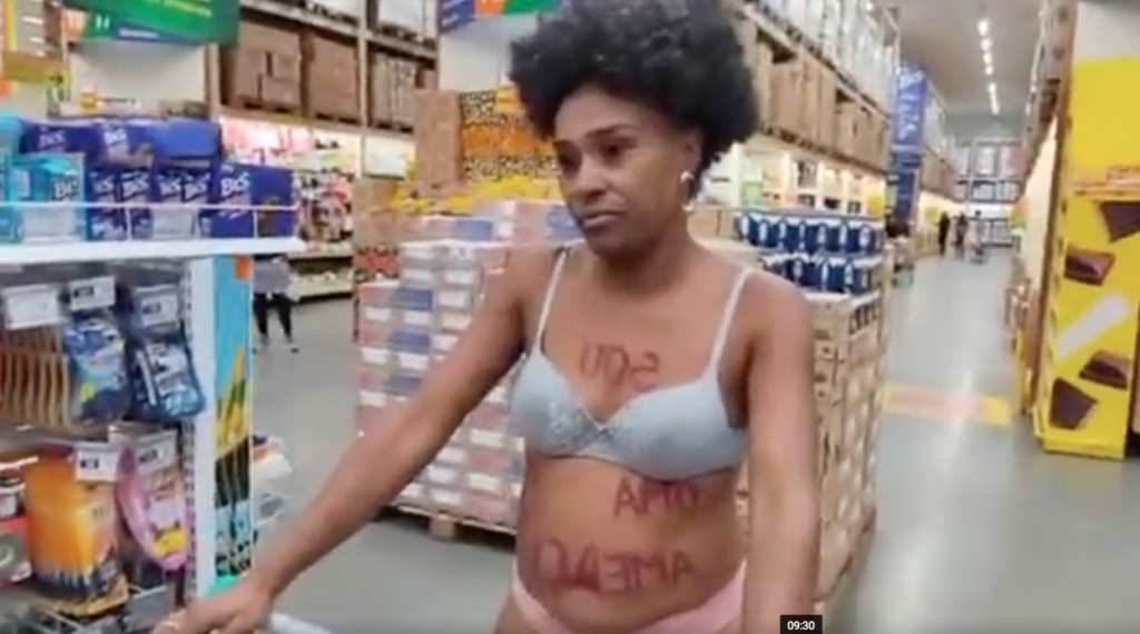 A professora Isabel Oliveira foi seminua a uma loja do mercado Atacadão nesta sexta-feira (7) em protesto contra o modo como foi tratada no local. Segundo ela, no mesmo dia, quando tentou fazer compras, ela foi seguida por um segurança durante o tempo todo. Sem a roupa, ela pretendia mostrar que não estava armada nem tinha como esconder nenhum produto para furtar. O Atacadão respondeu dizendo que não houve abordagem indevida (veja nota abaixo).