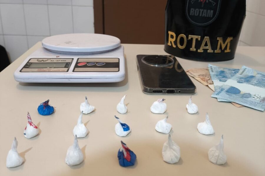 Dando continuidade à ação, os policiais realizaram buscas em um estabelecimento comercial vinculado ao homem. No local, foram encontradas outras quatro porções de cocaína, totalizando 15 unidades do entorpecente prontas para a venda, além de uma balança de precisão utilizada para a pesagem da droga.