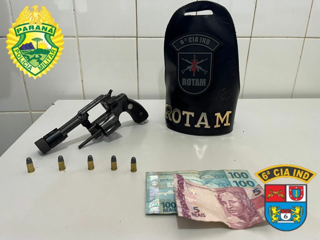 Após abordagem, foi localizado com um deles 1(um) revólver cal. 32, com suporte para supressor de ruídos (silenciador), MARCA I.N.A, NUMERAÇÃO 5803C, carregado com 05 munições da marca CBC intactas, que segundo os próprios abordados o armamento seria para cometerem um roubo na área central de Ivaiporã.