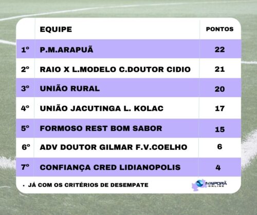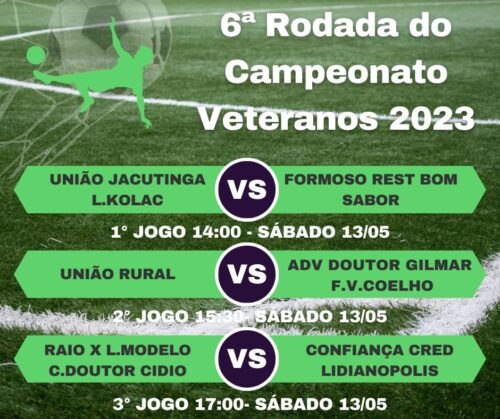 Fechando a 6ª e penúltima rodada o time do Raio x L.Modelo C.Doutor Cídio pode assumir a liderança se vencer o Confiança Cred. Lidianopolis, o jogo está marcado para começar as 17 horas. A Equipe que lidera o campeonato P.M.Arapuã não joga na rodada.