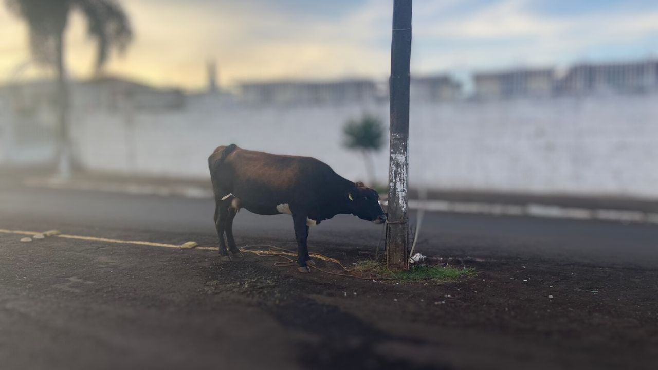 Uma vaca que estava amarrada a um poste sem acesso à água na Rua Rufino Rodrigues, no centro de Jardim Alegre, foi resgatada no sábado (20) após denúncias de organizações não governamentais (ONGs) de proteção animal.