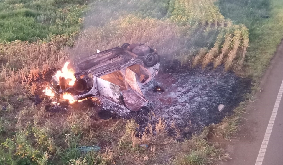 Um veículo VW/Gol ficou completamente consumido pelo fogo após capotar na rodovia PR-462 entre as cidades de Roncador e Iretama. O acidente ocorreu por volta das 23h30 desse sábado.