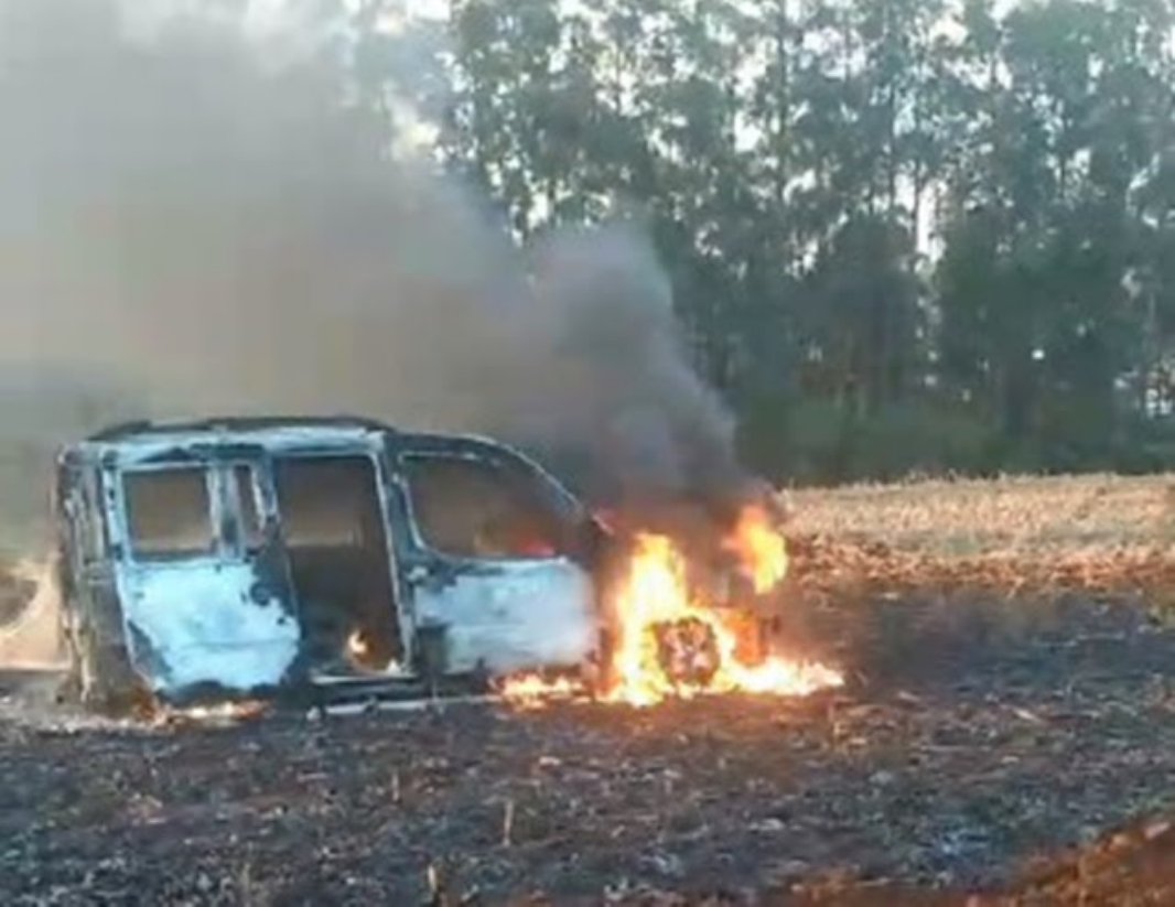 Enquanto a equipe policial registrava a ocorrência, chegou a informação de que o Fiat Doblo Adventure havia sido encontrado em chamas na cidade de Kaloré.