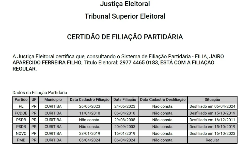 Certidão de Filiação Partidária de Jairo Ferreira Filho (Reprodução/TSE)