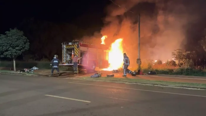 Um caminhão do Corpo de Bombeiros pegou fogo enquanto a equipe trabalhava para combater um incêndio em uma casa, em Campo Mourão, na região centro-oeste do Paraná, na noite desta sexta-feira (17).