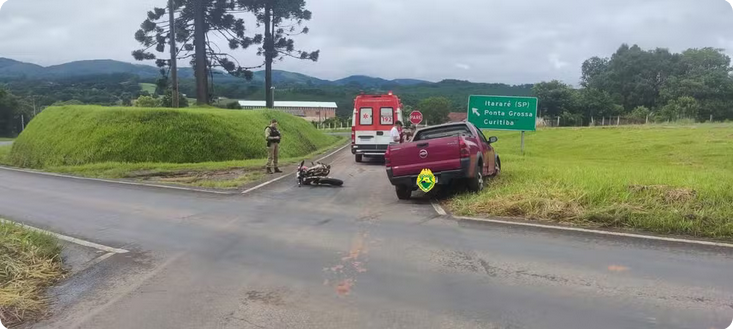Um policial militar de 41 anos ficou ferido ao ter a própria moto atingida pelo carro de um idoso de 87 anos que avançou em uma via preferencial na PR-090 em Piraí do Sul, nos Campos Gerais do Paraná. *** vídeo abaixo ***